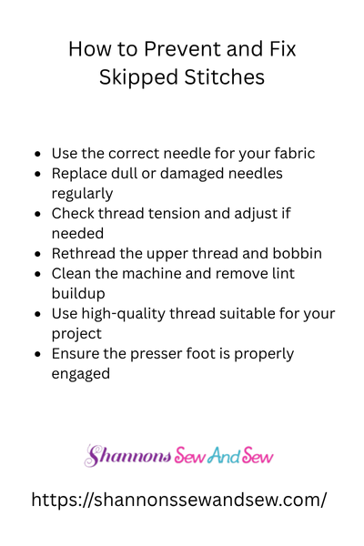 By now, you should have a solid understanding of how to prevent and fix skipped stitches. Remember, it’s all about making small adjustments and being patient with your machine. Don’t let those pesky skipped stitches keep you from creating beautiful projects — with the right tools and tips, you’ll be sewing smoothly in no time! Keep experimenting, and before long, you’ll be the master of stitch perfection. Happy sewing!